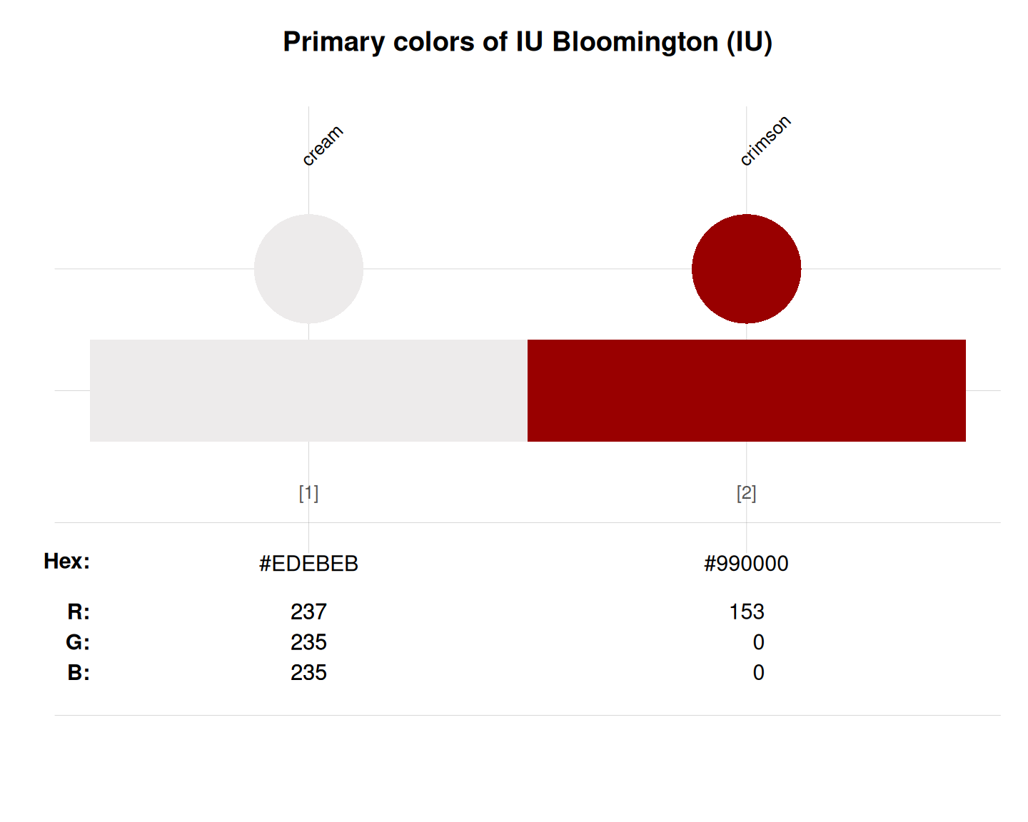 unikn::seecol(IU_1, main = "Primary colors of IU Bloomington (IU)") # view color palette